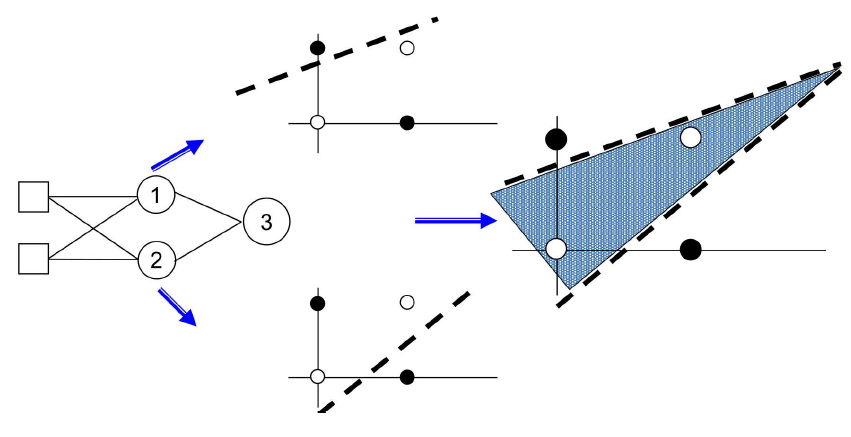 이를 해결하기 위해 하나의 퍼셉트론을 추가하여 두개의 평면을 그리는 방법으로 접근을 하게 됩니다.