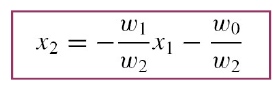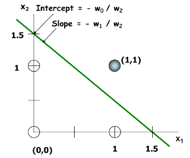 이때 기울기는 "-W1 / W2" 가 되고, 절편(Intercept)는 "-W0 / W2"가 되게 됩니다.